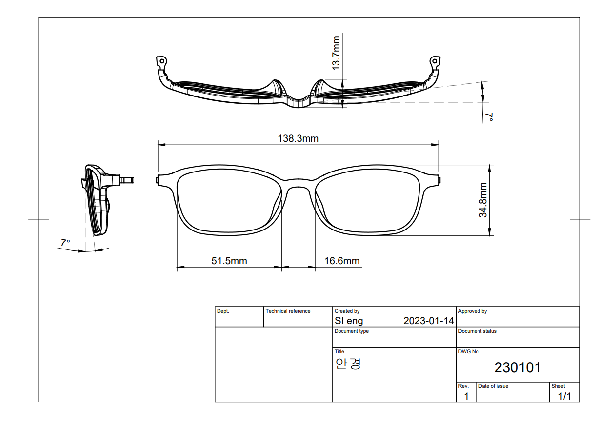 사진=SI eng, 안경 3D 제품설계 데이터를 간단하게 2D 도면 작성한 내용(자세한 내용은 3D뷰어 참고)